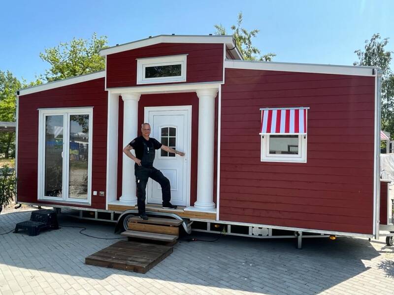 Und dennoch verliert sich beim Anblick des Tinyhaus "Malmö" jeglicher Gedanke an einen Wohnwagen. Seine Modellserie "Malmö" hat verschiedene Ausstattungsmerkmale. Das eine Haus bietet einen imposanten Eingangsbereich mit großzügigen Fenstern, an die im Stehmoment eine transportable Terrasse gestellt werden kann oder eben ein anderes Modell, bei dem die Terrasse bereits vorgebaut ist. Die Wünsche des zukünftigen "Hausbesitzers" werden schon im Auftragsmoment besprochen und entsprechend maßgefertigt.